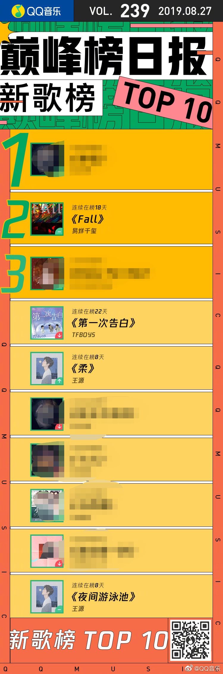 新歌排行榜前十名有四首歌曲,分别是钱Xi的《秋天》、组曲《第一次忏悔》、葛源的《温柔》和《夜晚的游泳池》。此外,每首歌已经连续出现在榜单上超过或等于八天,这表明粉丝们有多有能力进入榜单。