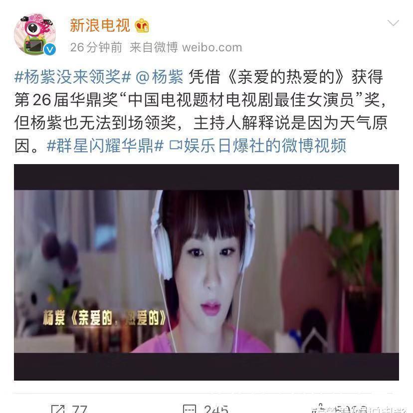 杨紫也没有出席华鼎奖颁奖仪式。主持人解释说原因是天气。事实上,杨紫正在拍摄《绿色宿主》。他不知道电影拍摄地的天气是坏还是澳门坏。简而言之,他认为由于天气原因,他不能参加华鼎奖。虽然他获得了第26届华鼎中国电视剧最佳女演员奖,但杨紫无法当场获奖,所以奖项也是空。这是设立该奖项的规定。