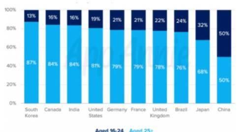 用于颤音的APP的年龄分布偏向年轻群体。