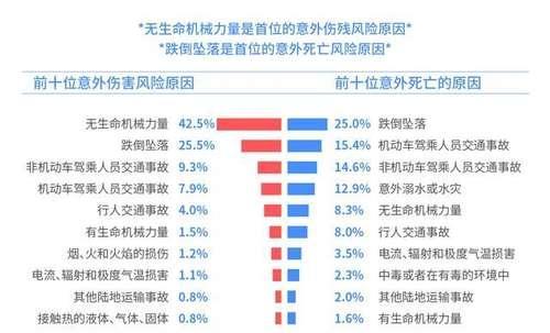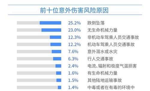 划分意外伤害风险的原因,跌倒是第一位的;从重大事故的原因来看,交通风险频发,约占33%,是世界上交通事故死亡人数最多的国家。