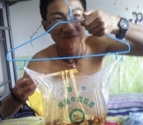 把拉面挂在衣架上:有人试过吃吗?看到这个同学吃得很开心,说大家都懒,或者很少带食物回宿舍吃,那么在宿舍买一双碗筷,会变得这么难吗?