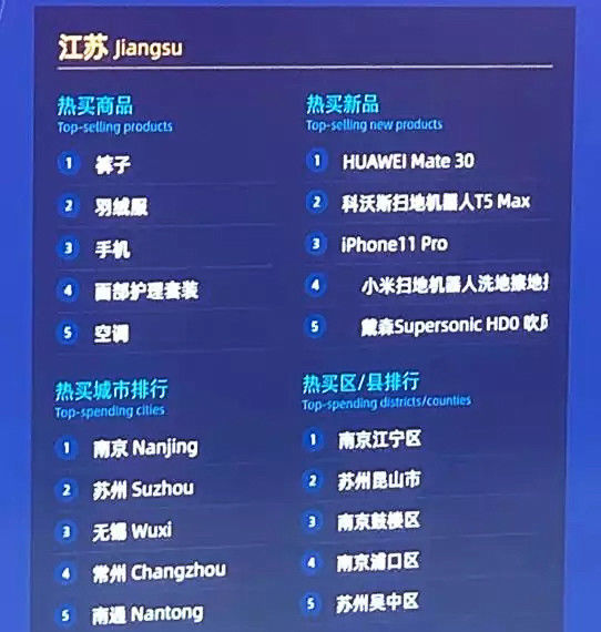 在前一个小时的营业额中,购买最多的城市是南京、苏州、无锡、常州和南通。南京江宁区在热销区/县排名中名列第一,超过苏州昆山市。当然,昆山人每年都在双十一之前获胜。