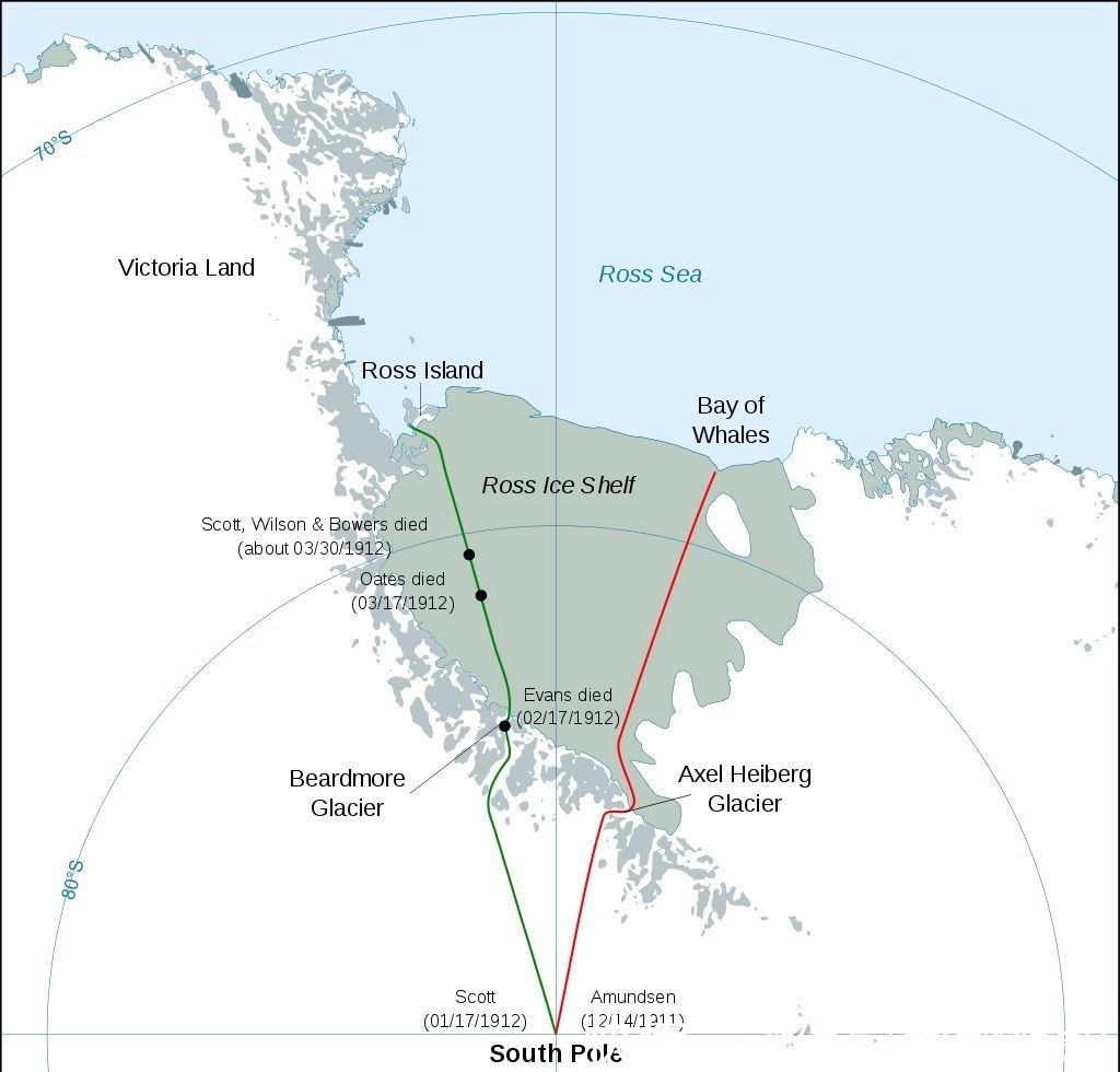 ▲阿蒙森和斯科特的探险路线:绿色代表斯科特,红色代表阿蒙森