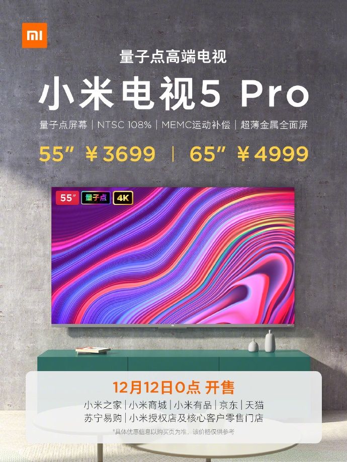最后,55英寸版小米电视5 Pro55售价3699元,65英寸版售价4999元,将于12月12日正式推出。
