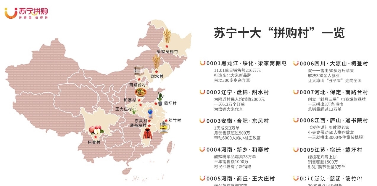 社交电子商务用户陷入困境,“苏宁购物村”按下了村庄复兴的快捷键。所谓联合收购村,是指苏宁联合收购年营业额在500万元以上,10%的“村”从事联合收购或相关工作的行政村。