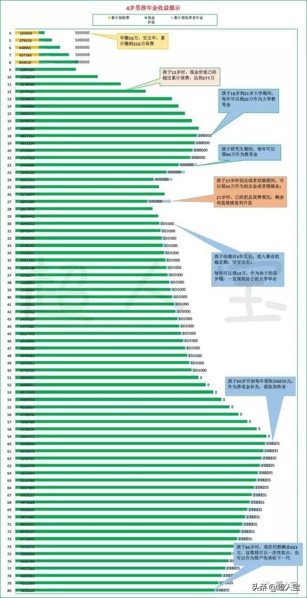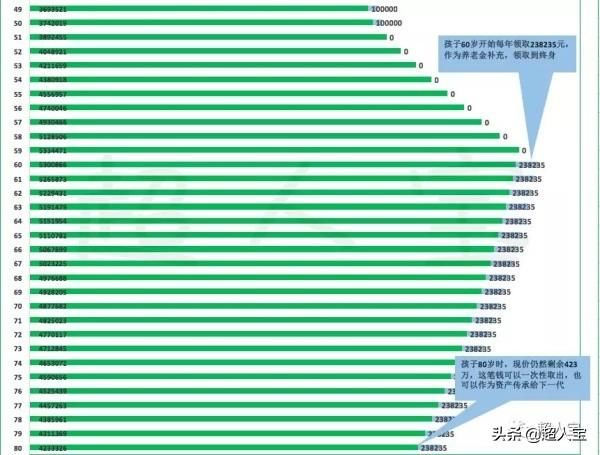 当孩子60岁时,他可以每年自动领取238235元作为养老金的补充,并终身领取。他真的很关心自己的生活,并且陪伴了他很长时间。