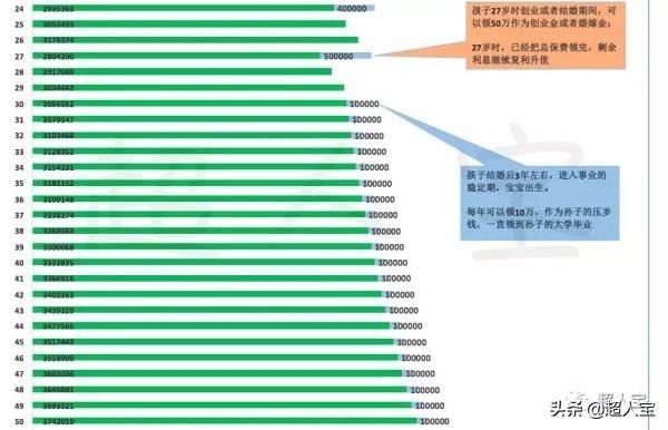 当孩子27岁时,他或她将一次性获得50万元作为启动基金或婚姻基金,共计250万元。