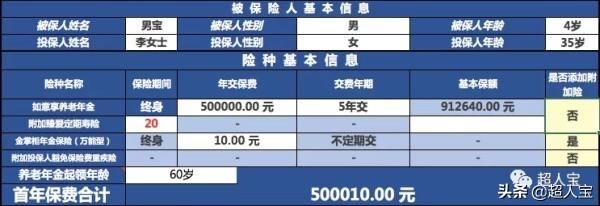 ,看到超哥的漫画后觉得保险也挺好的,考虑的需求是给2个孩子的教育金和自己的养老存一笔钱沟通后,客户说他希望每个孩子在5年内每年节省50万元。因此,朝戈选择了一种高流动性的养老保险,并为他的孩子设计了以下教育基金计划