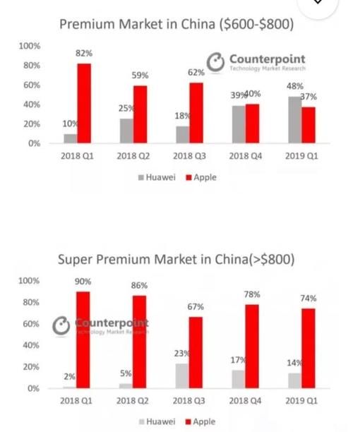 同样从对位研究报告来看,华为在2019年第一季度以600-800美元的价格在国内市场超过苹果,但800美元或更高的价格仍有很大差距。放眼中国市场,除了苹果占据800美元以上的大部分市场之外,华为的P系列和Mate系列在过去两年也迎头赶上,尤其是以华为的Mate X 5G为代表的折叠式屏幕5G手机,已经完全让中国智能手机大开眼界,16,999元的价格震惊了许多熟悉高价苹果的外国果粉。