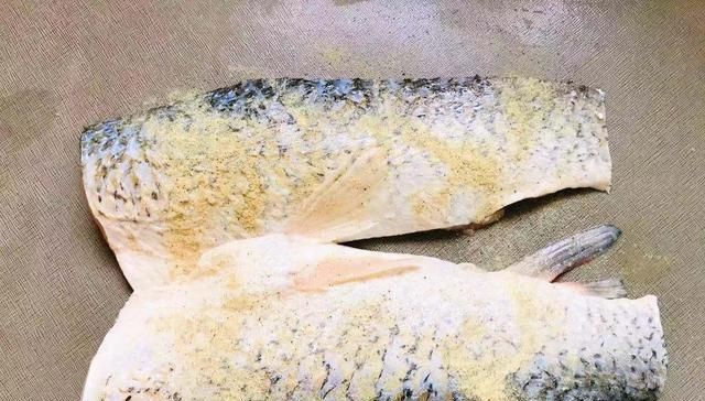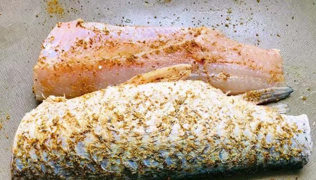 “四川烤鱼”练习:鱼排干水后,在鱼身上涂抹1勺盐和1勺料酒,在鱼身上洒上1勺白胡椒粉和2勺孜然粉,用手均匀涂抹,腌制20分钟去除腥味。
