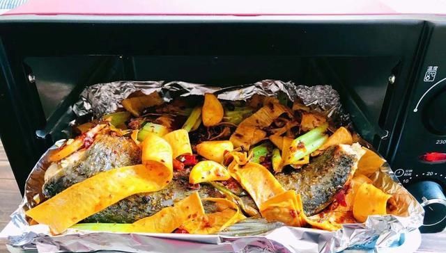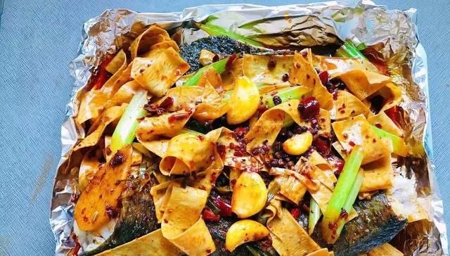 取深烤盘,先铺一层锡纸,到烤鱼的时候,打开烤箱,带隔热手套取出烤盘,将烤鱼转移到深烤盘中,倒入新鲜油炸的辣酱、豆皮和芹菜,打开烤箱200度,将深烤盘放入烤箱中8-10分钟品尝。