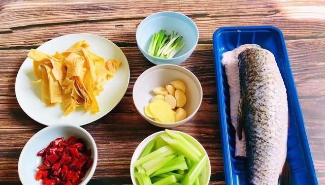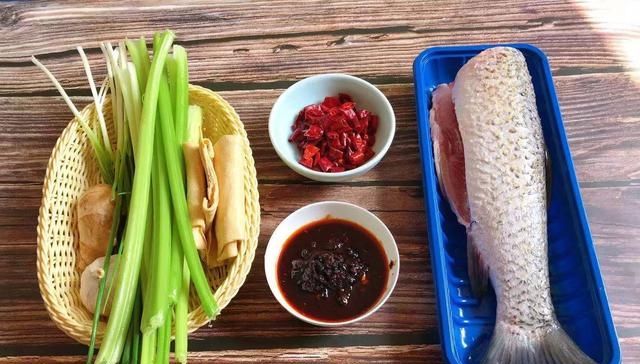 “提前准备”:草鱼刮鱼鳞去除内脏器官,撕下腹腔一层黑色薄膜,切去鱼头和鱼尾,将鱼身切成半纵向,漂洗干净,将豆皮切成稍宽的条状,用茎清洗芹菜叶,切成小斜块,将洋葱切成段,大蒜,生姜片去皮,将干辣椒籽取出,切成小块备用。