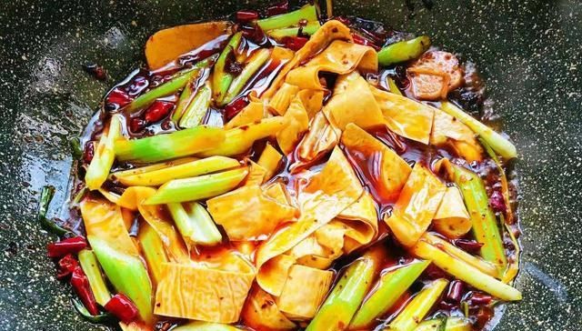 然后加入半碗清水,把火煮沸,把沙司煮沸,加入切好的豆皮和芹菜,煮5-8分钟,让豆皮和芹菜变味,煮好后关火。