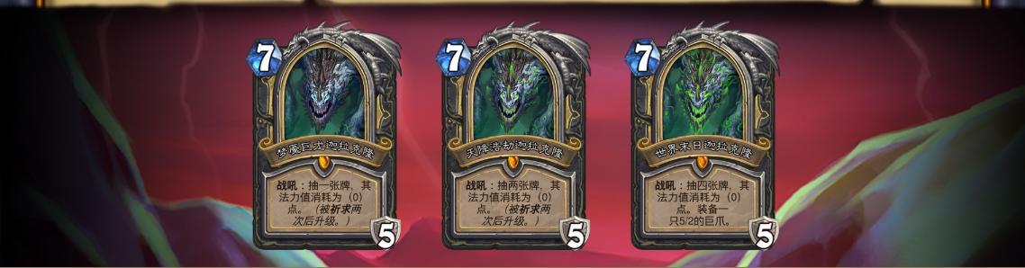 所有龙的终结者银河克隆体(Terminator Galaclone)将被转化为五张全新的英雄卡,分别对应战士、术士、萨满、潜行者和牧师。各行各业的加拉格尔克隆人都有强大的战争咆哮和英雄技能。然而,新觉醒的纳迦朱娜克隆人还没有完全恢复力量,奇怪的盗贼军团也需要龙追随者的帮助向纳迦朱娜克隆人祈祷,以便完全唤醒他的力量。