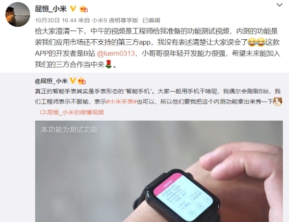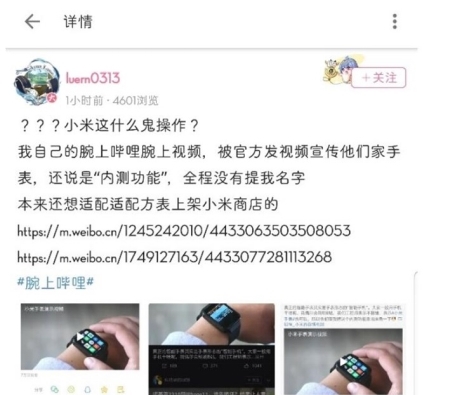 为了宣传小米手表的强大功能,小米生态连锁总经理曲衡在微博上发布了一段功能演示视频,使用小米手表观看蜂箱视频。然而,有人指出存在侵权行为。尽管曲衡马上出来道歉,但他还是招来了许多抱怨和指责。