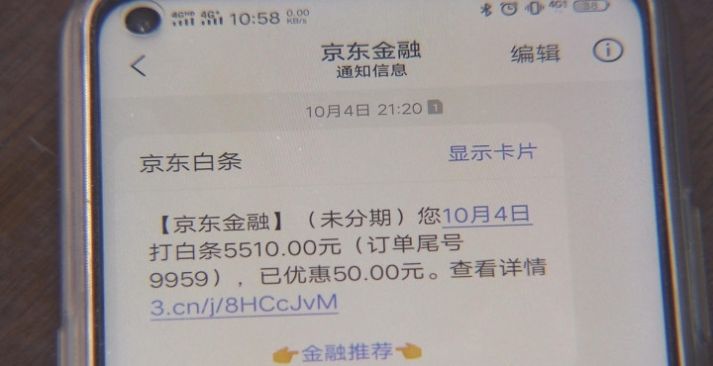 后来,李先生查看手机,发现手机上京东金融当天提示消费的短信只显示“京东金融通知信息”。手机上找不到号码。他去手机运营商那里拉自己的短信记录,上面没有京东金融提示消费的短信。然而,JD.com金融发送的其他广告信息可以在他的手机上看到并找到这个号码,这让他更加困惑。京东白条最多刷多少