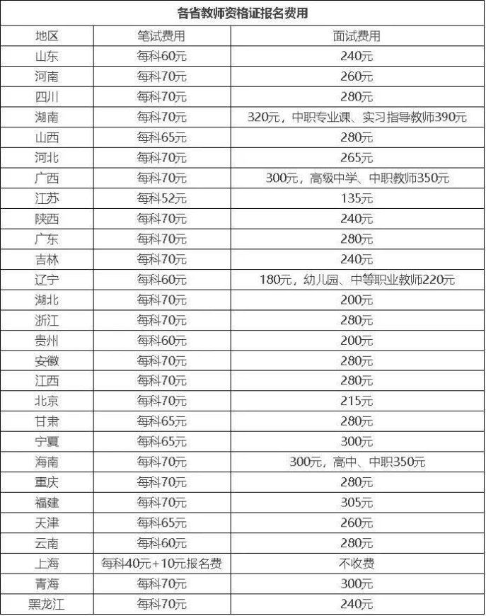 各地教师证书笔试和面试申请费