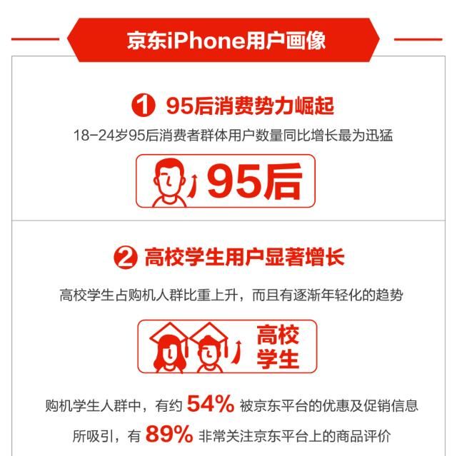 其中,JD.com在通过用户肖像和大数据分析向陷入低迷的市场中的用户推出多轮苹果降价促销广告方面发挥了重要作用。根据京东的数据,大约54%购买飞机的学生被JD.com的折扣和促销信息所吸引..