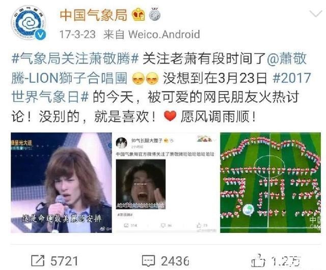 事实上,早在2017年,气象局就注意到了萧敬腾的“雨神”。中国气象局的官方博客也特别发布了一篇帖子,称:“大家都在热烈讨论对萧劳的关注。事实上,除了喜欢,没有别的了!愿风雨无阻”。