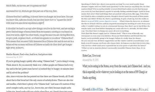 另一个外国人回答说:“如果你在吃了中餐后一个小时内就饿了,那你一定是错了。每天有十亿多中国人吃中国菜。为什么你看不到中国人每天都在喊饿?”//