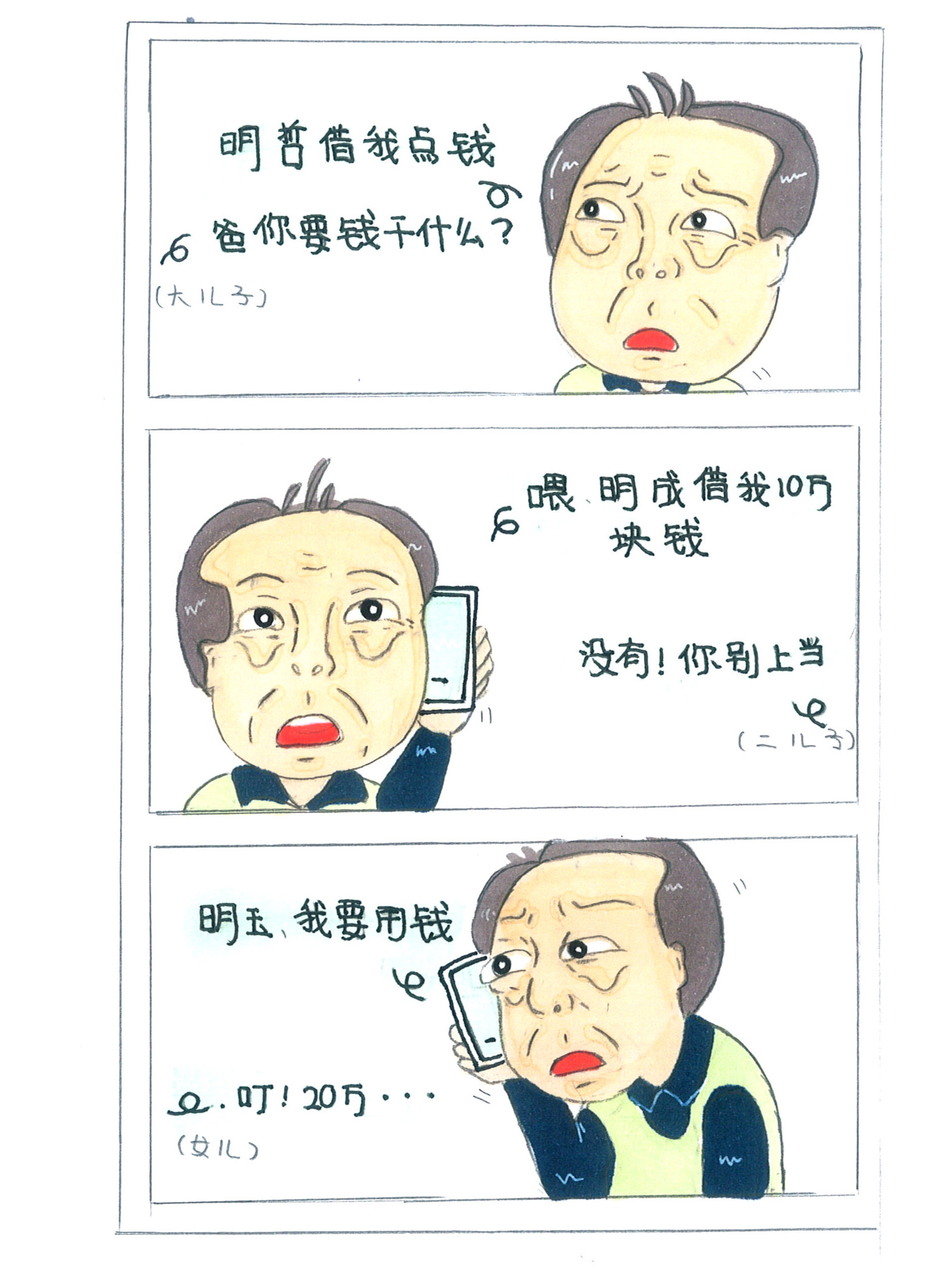 王晓庆:动力来自职业需求。我的工作要求我完成这些漫画,并把它们从我们自己的公开号码中发送出去。以前,我曾想过把我对绘画的兴趣和我的日常工作结合起来,但是没能找到一个很好的时机来实现它。这次有这样一个宣传的机会。我们的领导和同事都非常支持它,并说:“我们这里的小女孩会画画,这很好。”另一点是由于我自己的感觉。我看过一则电视新闻报道,报道一位平时不愿花钱的老人去世了。结果,当他的儿子和女儿穿过房子时,他们发现老人用他多年辛苦工作后积蓄的钱在家里堆积了许多保健品。我只是觉得想想那些关心老人金钱的骗子是可恶的。那是很久以前的新闻,我一直记得。