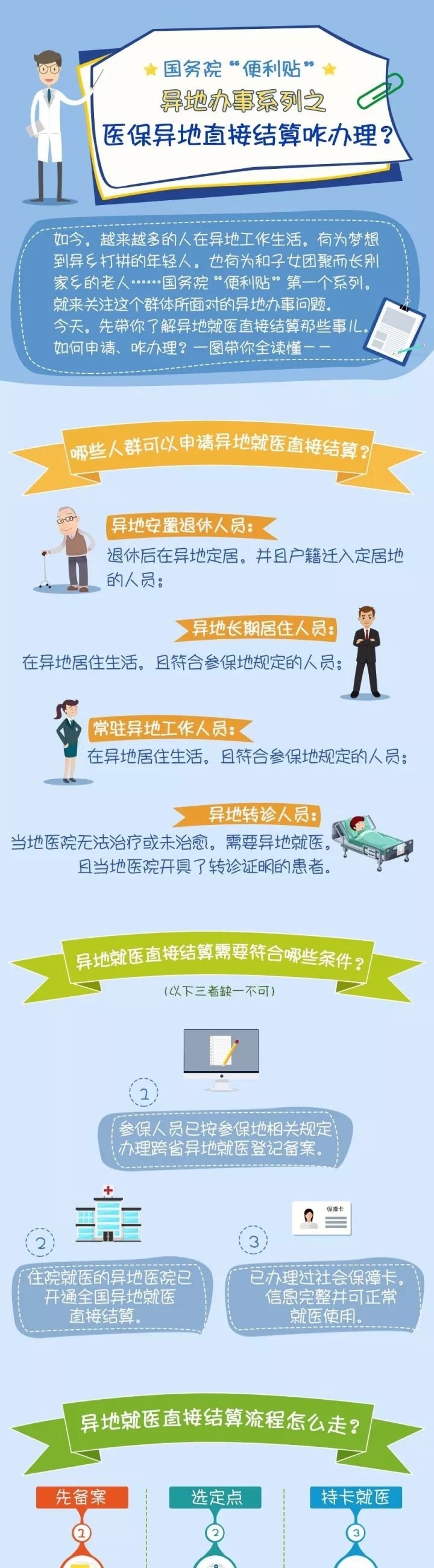 异地办理跨省就医直接结算的居民需到参保地经办机构备案,并选择跨省定点医疗机构。职工医疗保险和城乡居民医疗保险参保人员可以携带社会保险卡。参加新型农村合作医疗的居民可携带身份证或新型农村合作医疗证到定点医疗机构就医,实现直接结算。
