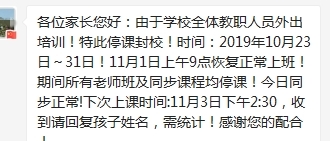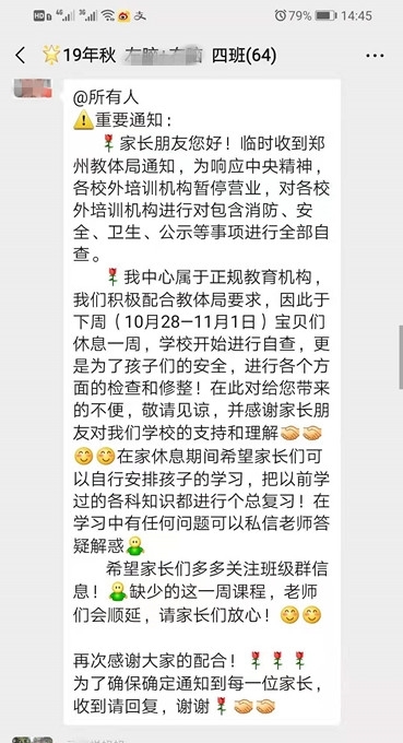 这个周末,郑州的许多培训班似乎暂停了。培训班上有不同的意见。有人说天气正好适合学生们出去秋游。有人说所有的老师都出去学习了。父母感到困惑,这种情况以前从未见过!在与其他学区的家长沟通后,我们得知不少学校关闭了。这个周末孩子们更加放松和快乐。