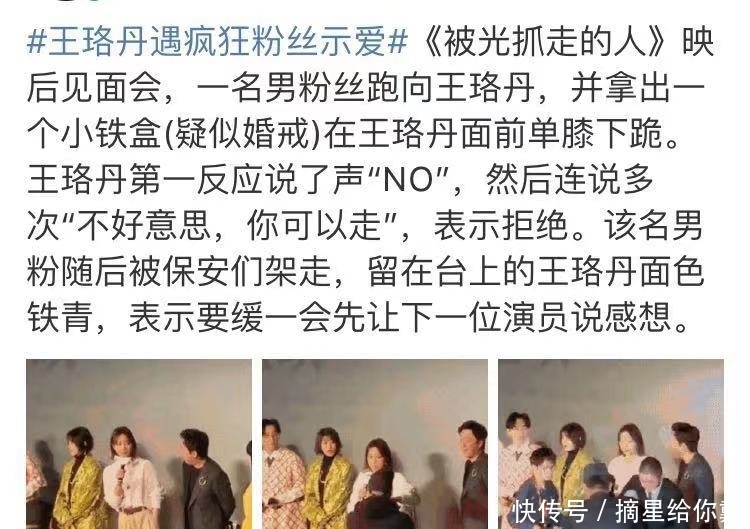 12月9日,王罗丹和黄博参加了一个宣传电影《被光抓住的人》的活动。节目结束后,当他们讲话时,他们遇到了跪下来表达爱意的男粉丝,这让王罗丹很害怕。