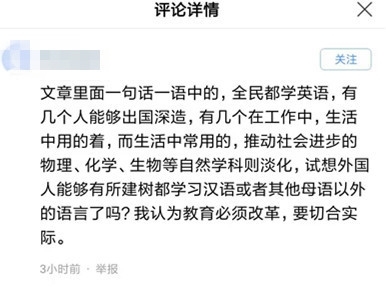 我们的学生几乎从学习汉语的一开始就开始学习英语。回头看看我们周围的孩子,没有多少人有汉语补习班,但是很少有人想说没有英语补习班。英语学科的位置曾经在中国数学排行榜上名列前茅。学生和家长在学习英语上花费的金钱和精力比汉语和数学多得多。然而,正如网民所说,除了一些特殊的行业和出国留学,并不是所有的孩子将来都能用英语工作。英语作为交流工具的作用也被翻译软件所取代。因此,英语作为一种语言远不能与汉语和数学等基础学科竞争。