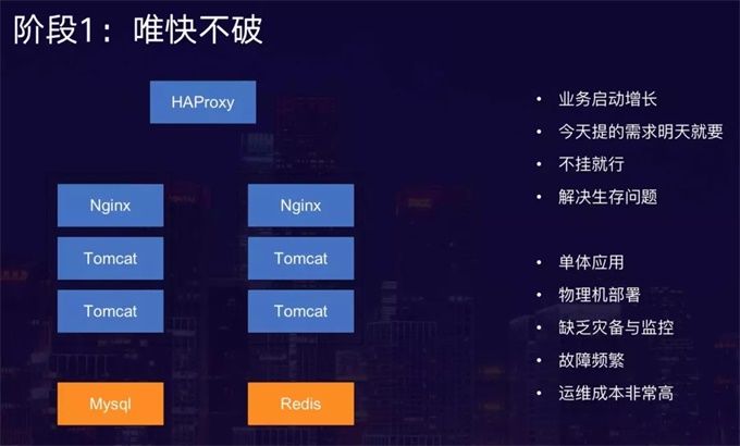 在架构开发过程方面,京东第一阶段的应用结构是单一应用。例如,在物理机器上部署Nginx Tomcat需要非常简单和快速的要求。复杂的设计要花很多时间,简单而粗糙,一堆代码可以在上面运行。当然,这种设计的缺点也很明显,即运行和维护成本很高,没有备灾部署,服务器被挂机或挂机。