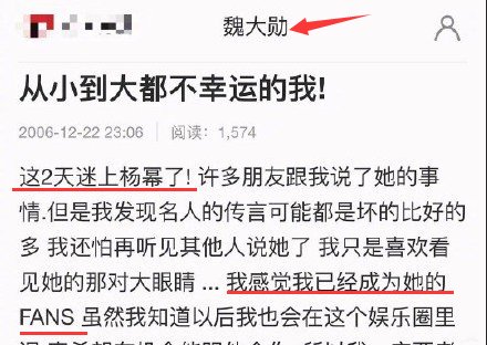 13年前,也就是2006年,一些网民黑掉了魏大勋的博客。在博客中,魏大勋提到,他对小杨的大眼睛很着迷,并成为她的粉丝。他希望与杨迷你合作,因此他希望被中央戏剧学院录取。可以看出,魏大勋是小杨的忠实粉丝。