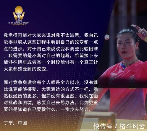 在接受国际乒乓球联合会采访时,丁宁表示,丁宁知道人们可能对她的表现不满意,但她觉得自己已经做出了一些改变和进步。丁宁说:“我需要的是不断超越自己。我希望明年或某个时候,每个人都会有真正的改变。”谈到奥运会比赛,丁宁承认她面临着困难,但她认为还有比哭更重要的事情,那就是知道自己在做什么,一步步努力。