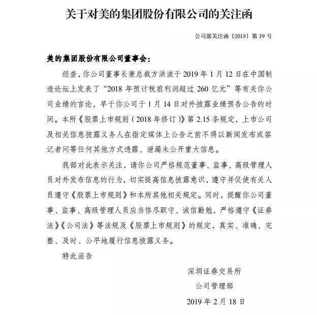 2月18日晚,深交所向美的集团发出关注函。2019年1月12日,公司董事长兼总裁方洪波对公司业绩发表评论,如“2018年税前利润预计超过260亿元”,比公司1月14日公布业绩预测的时间提前。深交所对此表示关注,要求公司严格规范董事、监事和高级管理人员对外发布信息的行为,有效提高信息披露意识。