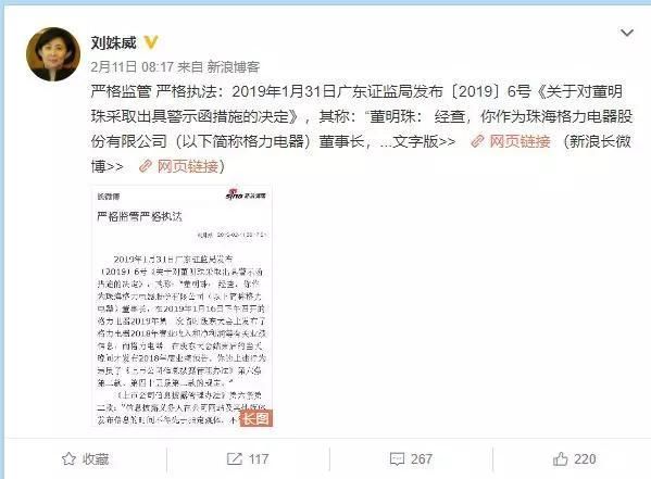 2月11日,新任命的格力电气唯一董事刘姝威为“好朋友”董明珠题字“严格监管,严格执法”。她在文章中表示:“如果广东证监局向董明珠发出“警告信”,而对方洪波没有发出警告,广东证监局会有选择地执法吗?”是方洪波提前泄露了结果。