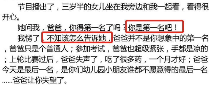 面对三岁女儿的问题,“爸爸,你是第一个吗?”刘洋甚至不知道如何回答,他的心里充满了复杂的感情。节目播出后,面对朋友们的鼓励和安慰,我只能说“谢谢”。