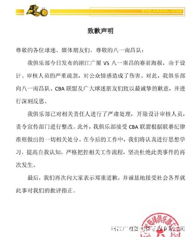 今天广厦男篮也在官方微博上发表了道歉声明。
