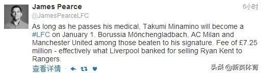 前利物浦回声报,现利物浦体育记者詹姆斯皮尔斯在推特上写道:“只要南野拓实通过体检,他将在1月1日成为利物浦球员。门程拉德巴赫、米兰和曼联都在争夺南野拓实的战斗中输了。利物浦将支付725万英镑,与瑞安·肯特的价格相同。”