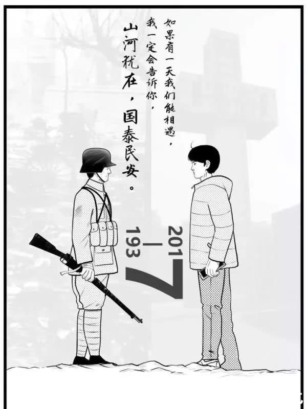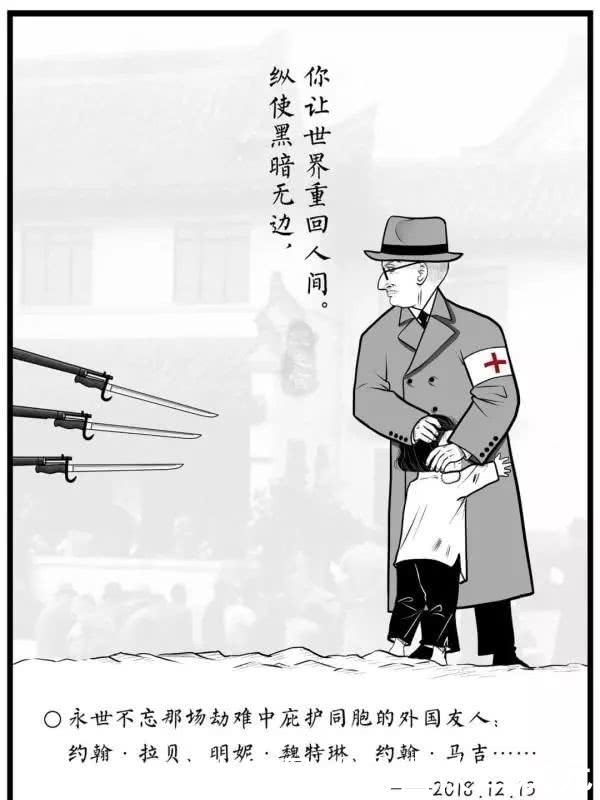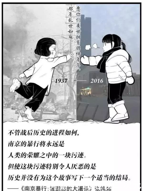 漫画家朱妍说:“2016年,我们创造了两个小女孩,其中一个在1937年逃离,另一个是2016年的小女孩,当她看到逃离的画面时,她想把小女孩从痛苦中解救出来。”在照片中,一个1937年的女孩和一个2016年的女孩在空对面互相面对,伸出手去抓住对方。这两者之间有一句话写道,“在那个混乱的时代,我希望你在来世成为我的”。