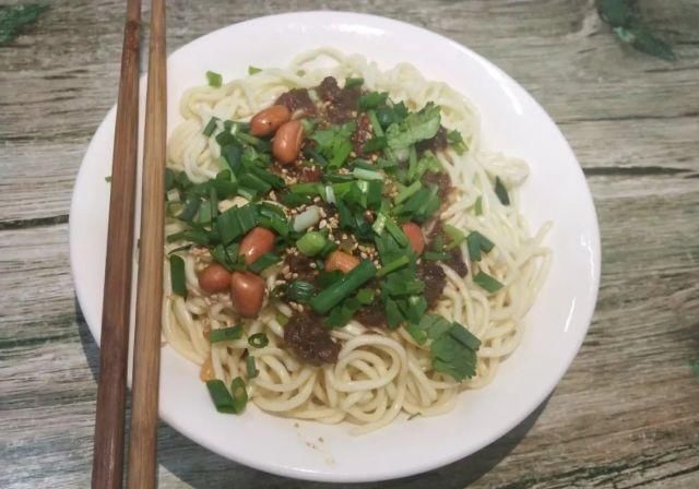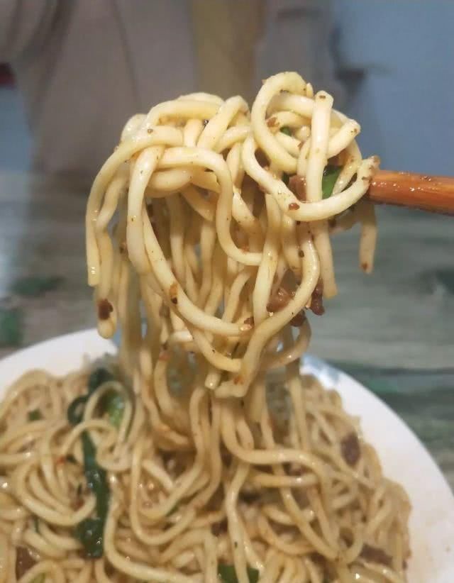 网民推荐的商店确实有一定的实力。从锅里煮面条,去掉一些水,然后加入一勺杂酱、花生、葱和一把芫荽。趁热拌好,面条会打Q,不软不烂。加入老板家里做的辣椒油。这两个字是:味道够了!