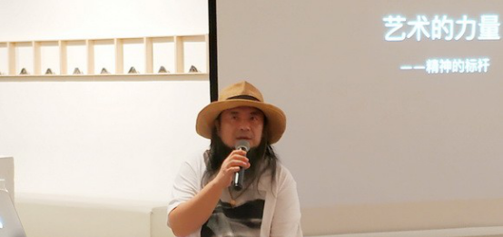 艺术家林岗向中国经济网记者李东阳致辞/照片林岗解释了古言的艺术特色,如“鸳鸯砚”、“鞋砚”、“瓶砚”、“朱雀砚”和“羊形汉白玉雕塑”。林岗同时展示了秦兵马俑雕塑和外国雕塑的图片,进行了艺术比较。林岗特别解释了“长信宫灯”的艺术美。他称赞“汉代雕塑和古希腊罗马雕塑是齐头并进的两座山峰”。