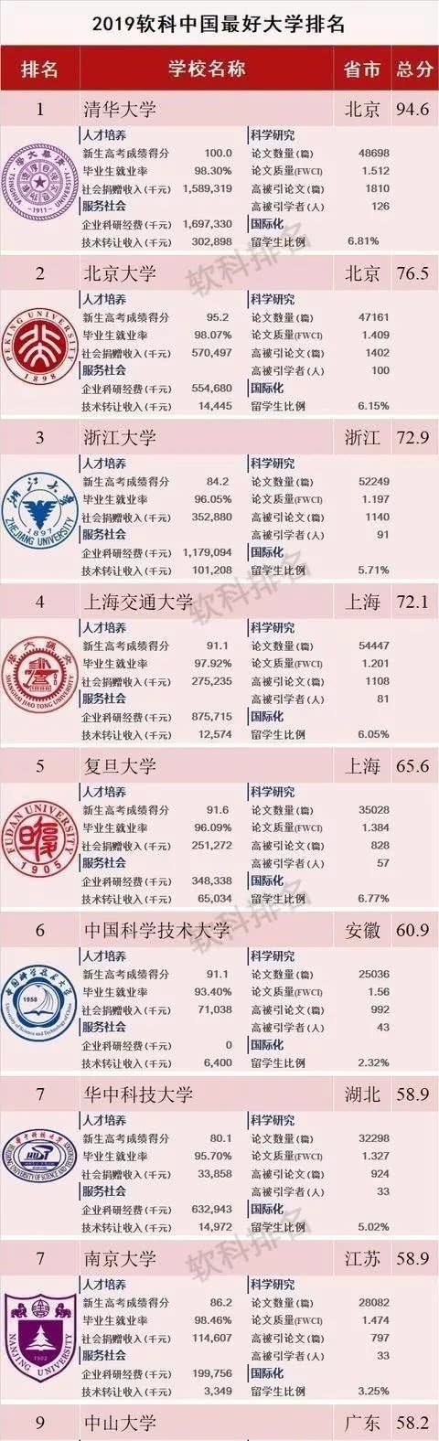 与2018年相比,前10名大学没有变化。它们是:清华大学、北京大学、浙江大学、上海交通大学、复旦大学、中国科技大学、华中科技大学、南京大学、中山大学和哈尔滨工业大学。这10份名单没有改变。唯一的变化是华中科技大学的排名从去年的第八上升到了第七,与南京大学并列。