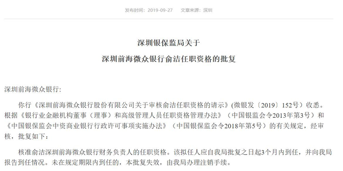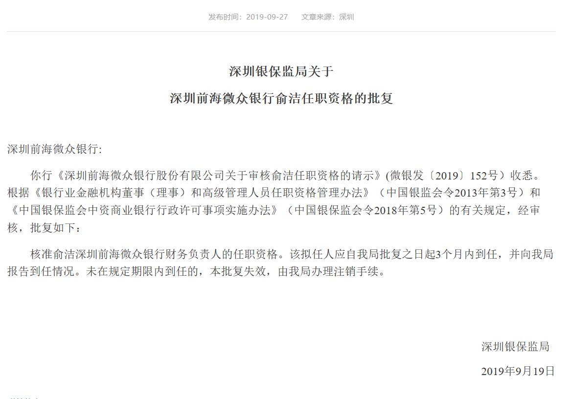 深圳前海微众银行财务负责人俞洁任职资格获准