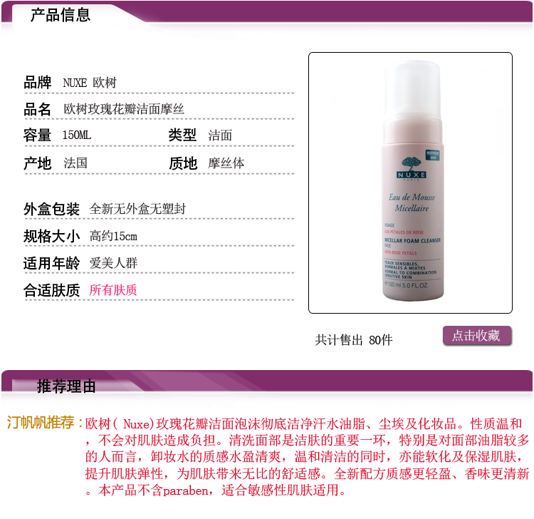 京东商城 NUXE 欧树玫瑰花瓣洁面摩丝150ml