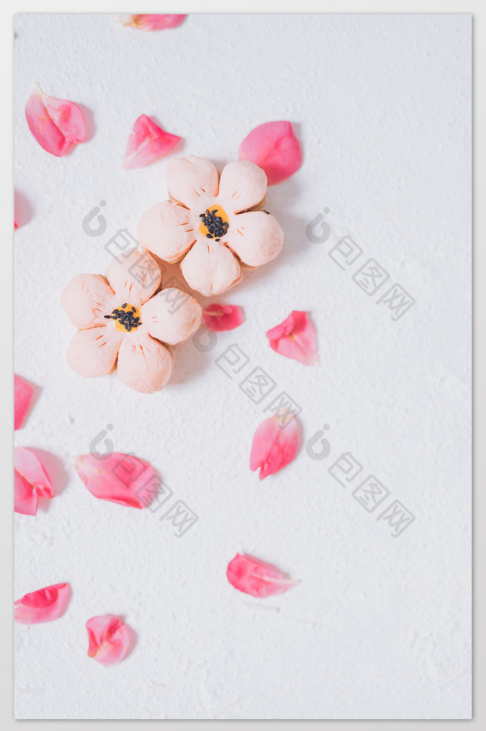 亮调白底粉色桃花酥花瓣美食静物摄影4