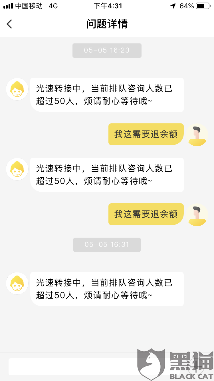 [最佳答案] 2020.03.2501057070565这个号码给我打电话了,2020.01.14今天01056496527给我回电了,承认他是小黄车公司的了,真恶心。在电话里一直告诉我她没有权限让我自己打电话。可是我的问题是电话打不通导致的余额退不了,你光告诉我客服电话有什么用?而且我还录音了,两个同样的电话号码说着不一样的话,也不知道是小黄车公司独自恶心还是交通委和小黄车一样恶心。反正我内心一万个呵呵。友情提示,01056496527的电话不要接,接了气的头晕,要么就说上两句话开始怼她们就好,就当减压放松心情了 2019.11.27今天又打了一次电话,忘了说了什么,交通委的记录人员给我来了一句“那就是企业的问题啦”,我TM能不知道是企业的问题吗?如果企业没问题我还给你们打电话吗?我突然很想哭。我不知道这种问题依靠政府部门解决不了我还能找谁。微博上很多人以怜悯的角度看最近韩国娱乐圈的事情,但是。。。2019.11.25010 5649 6527给我打电话的时候我问了那个号称交通委工作人员的工号,回复甚至是你无权询问这个问题。其实吧,这个问题是01012328的接线员让我问的。。。细思极恐2019.
