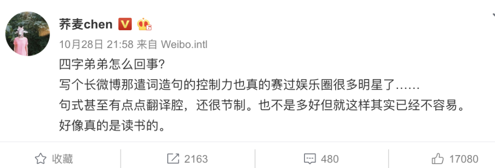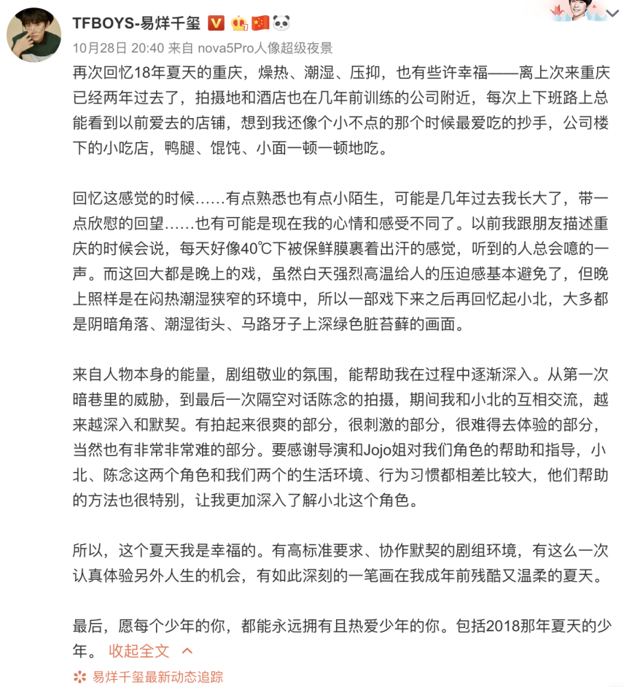 易烊千玺的小长文被作家荞麦夸赞:文字带