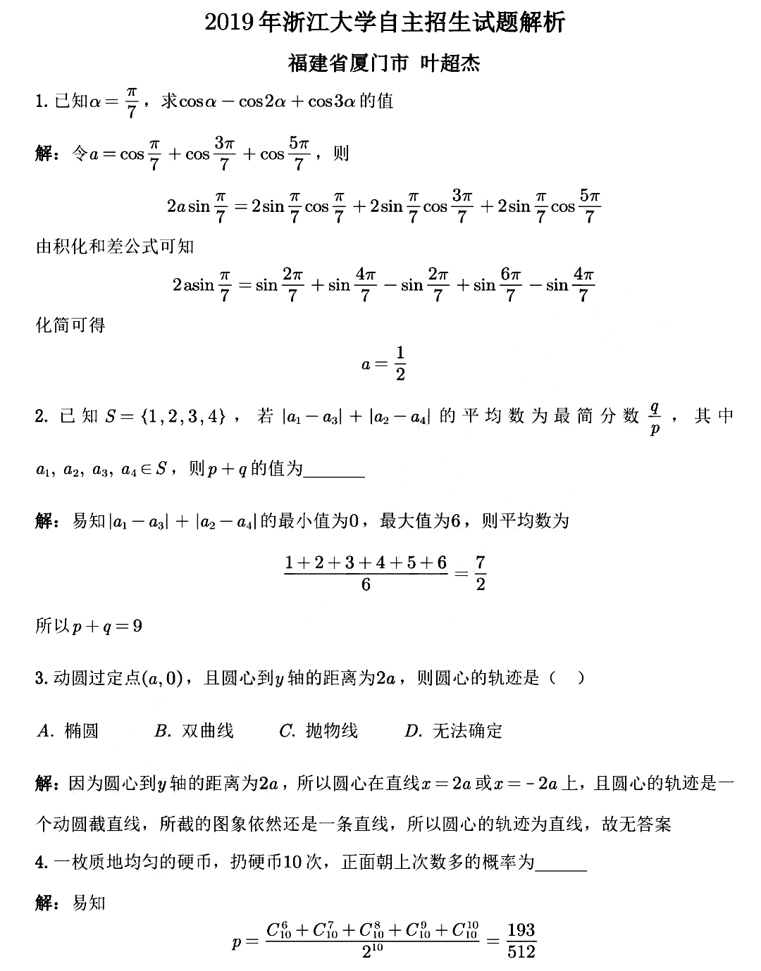 浙江大学2019年自主招生笔试真题参考答案