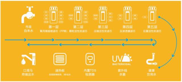 口渴马饮水可视化平台使用的净水器,是通过5层滤芯将残留漂白(余氯)、细菌病毒、泥沙铁锈、重金属水垢等对人体有害的物质直接过滤排除,制出健