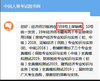 中国人事考试图书网官方消息公布:经济师19版将在7月8号上架销售,10号统一发货,19年经济师书籍有两个专业继续沿用18版,分别是房地产专业知识