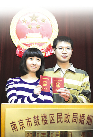 图为一对新人4日在南京玄武区民政局婚姻登记